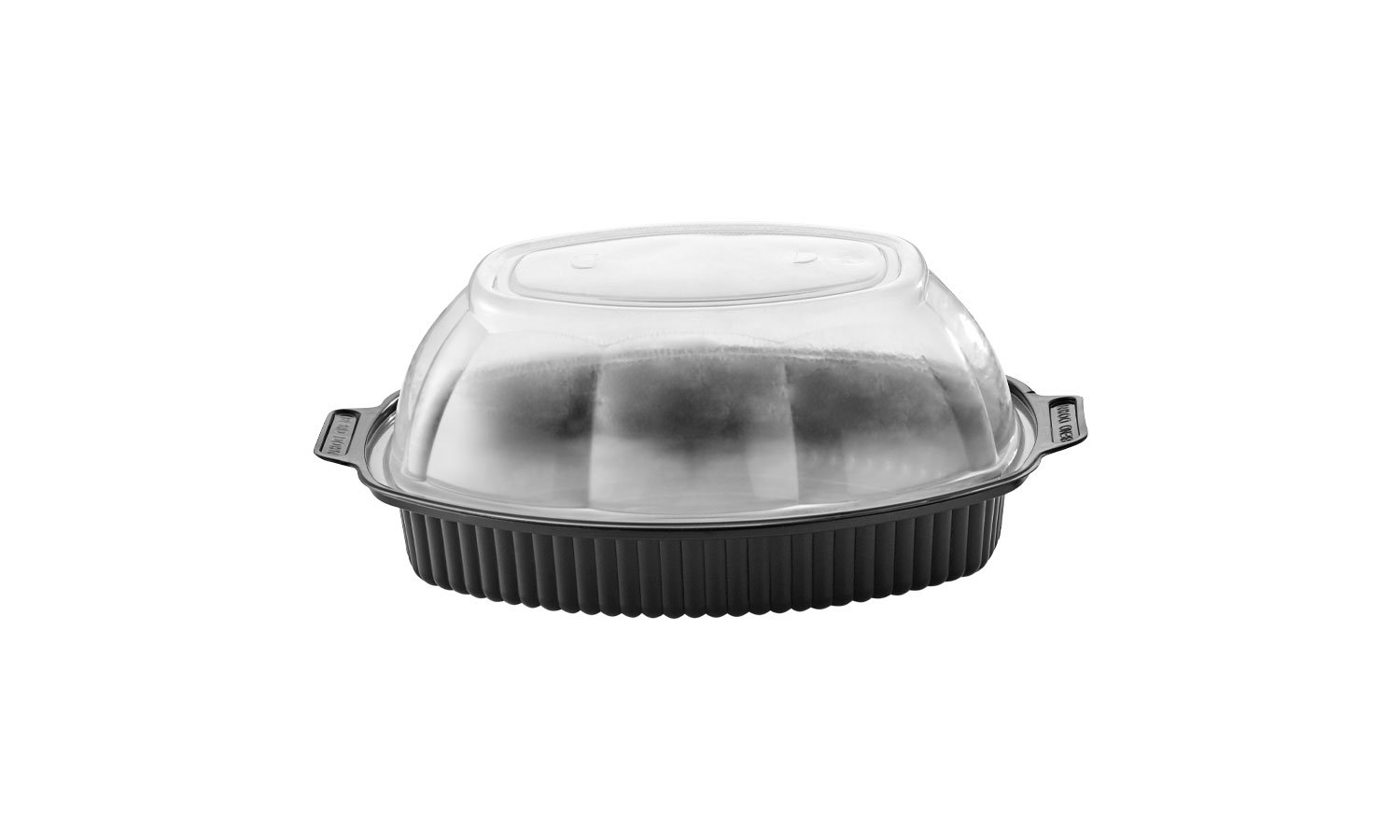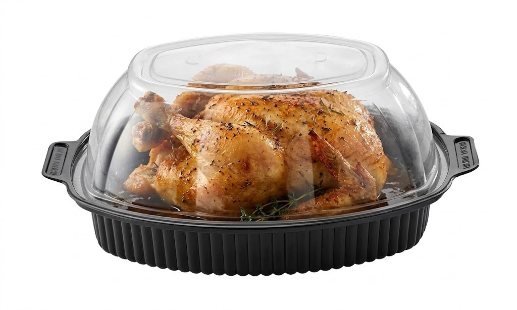 Bandeja negra de PP con tapa domo, perfecta para guardar y transportar pollo entero. Gran comodidad, asegura un almacenamiento eficiente y seguro.